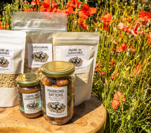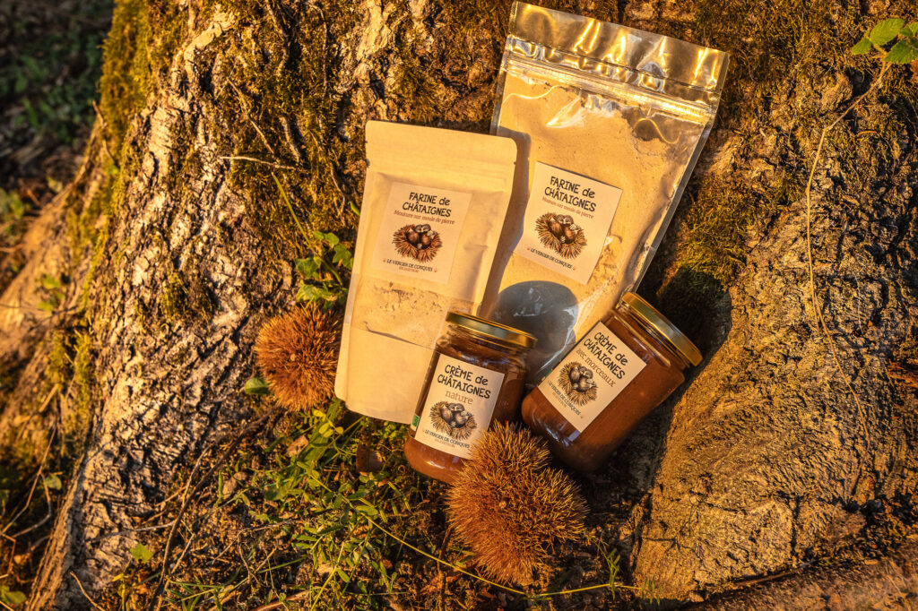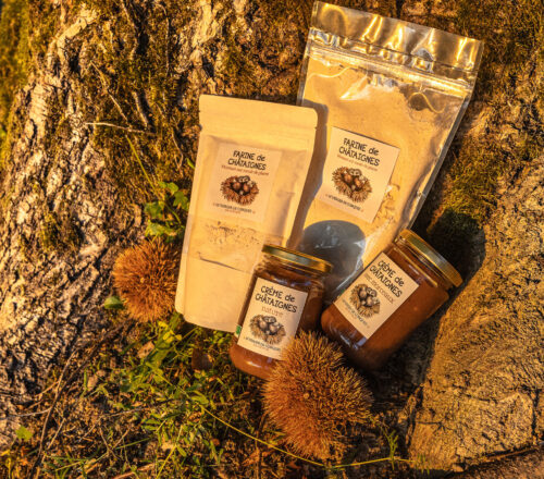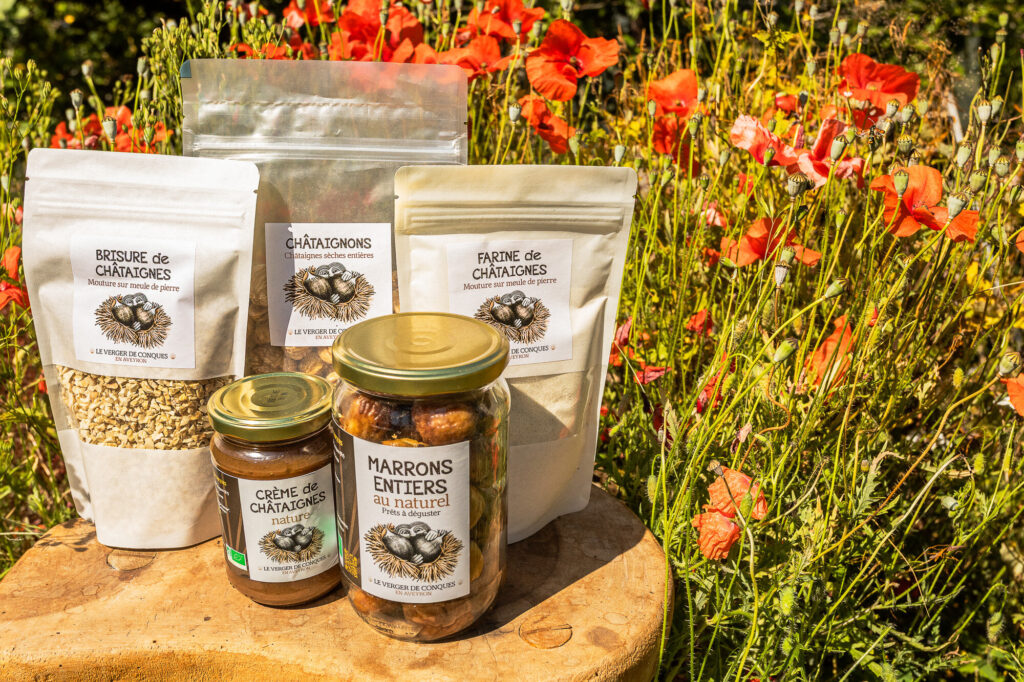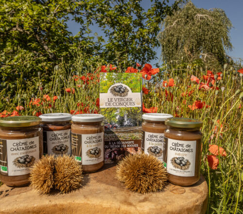 Le Verger de Conques vous propose toute une gamme de produits autour de la châtaignes : crème, marrons au naturel, farine, brisures.