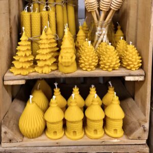 Bougies moulées avec de la cire d’opercule que je récolte sur les cadres au moment de l’extraction du miel.