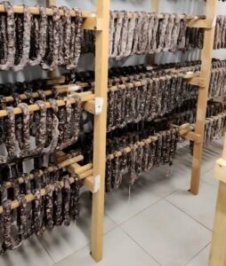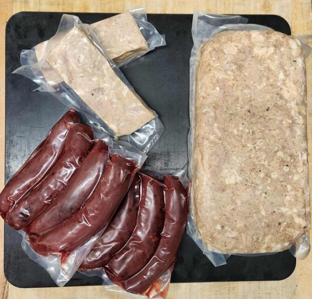 Terrines de pâté, jambonneaux, fritons de porc, saucisson à l’ail, fricandeaux, pâté de tête.
