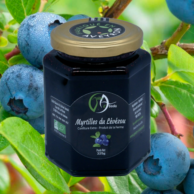 Confiture Extra De Myrtilles du Lévézou BIO, cueillies à la main sur notre exploitation et réalisée par nos soins à l’ancienne dans un chaudron de cuivre.