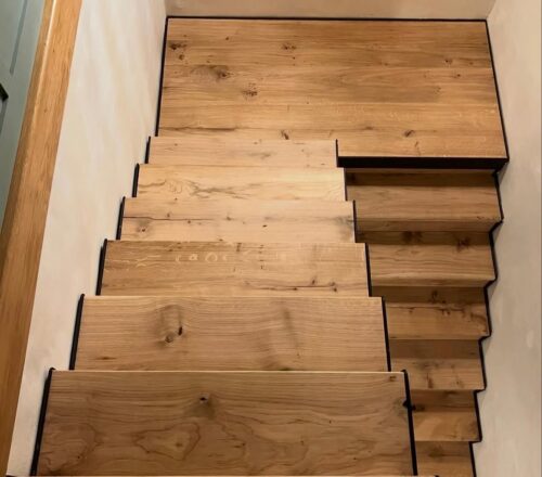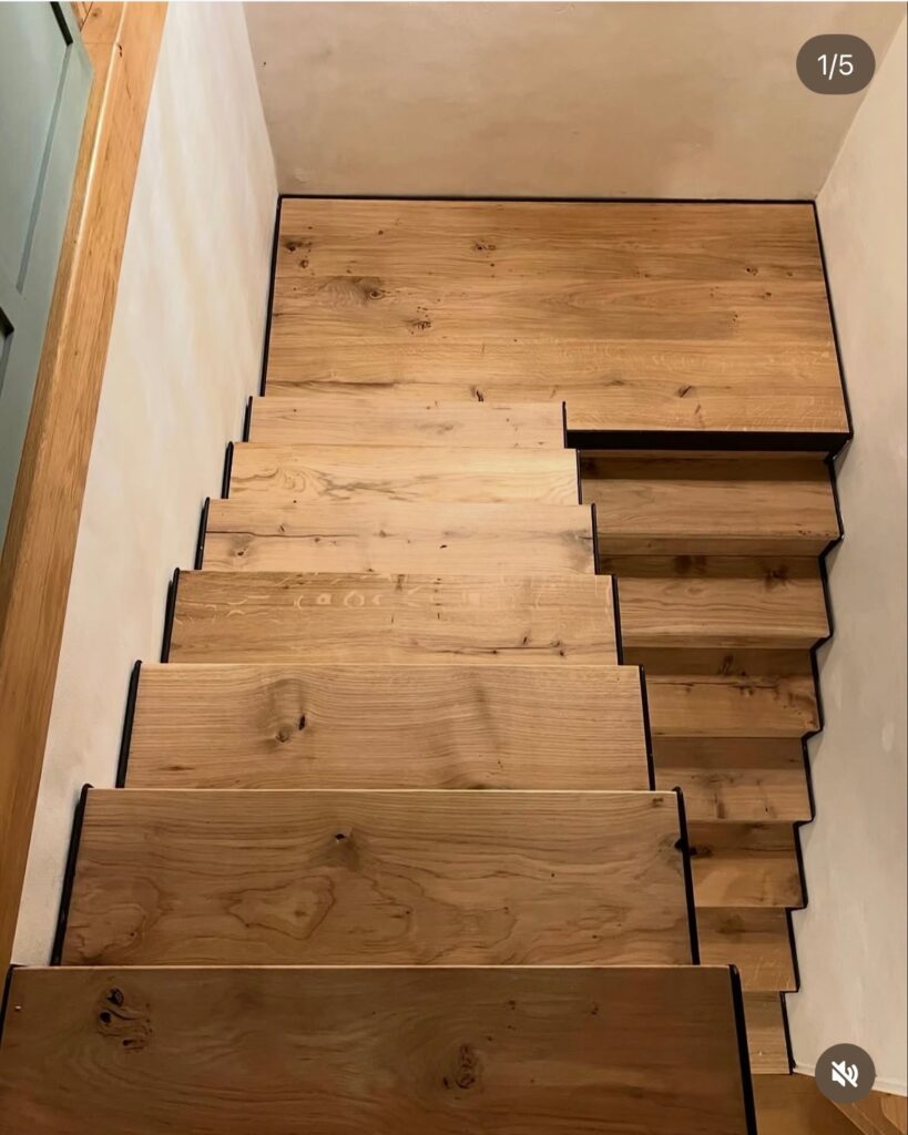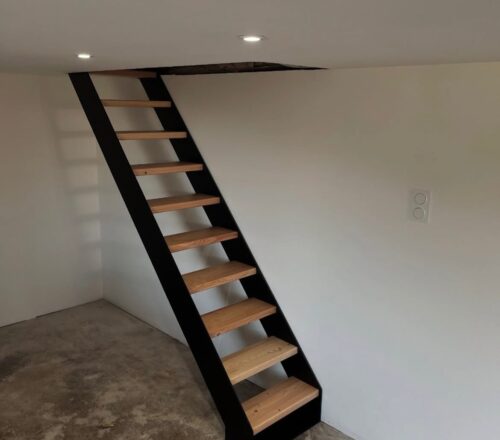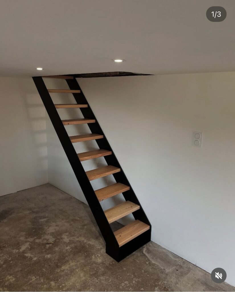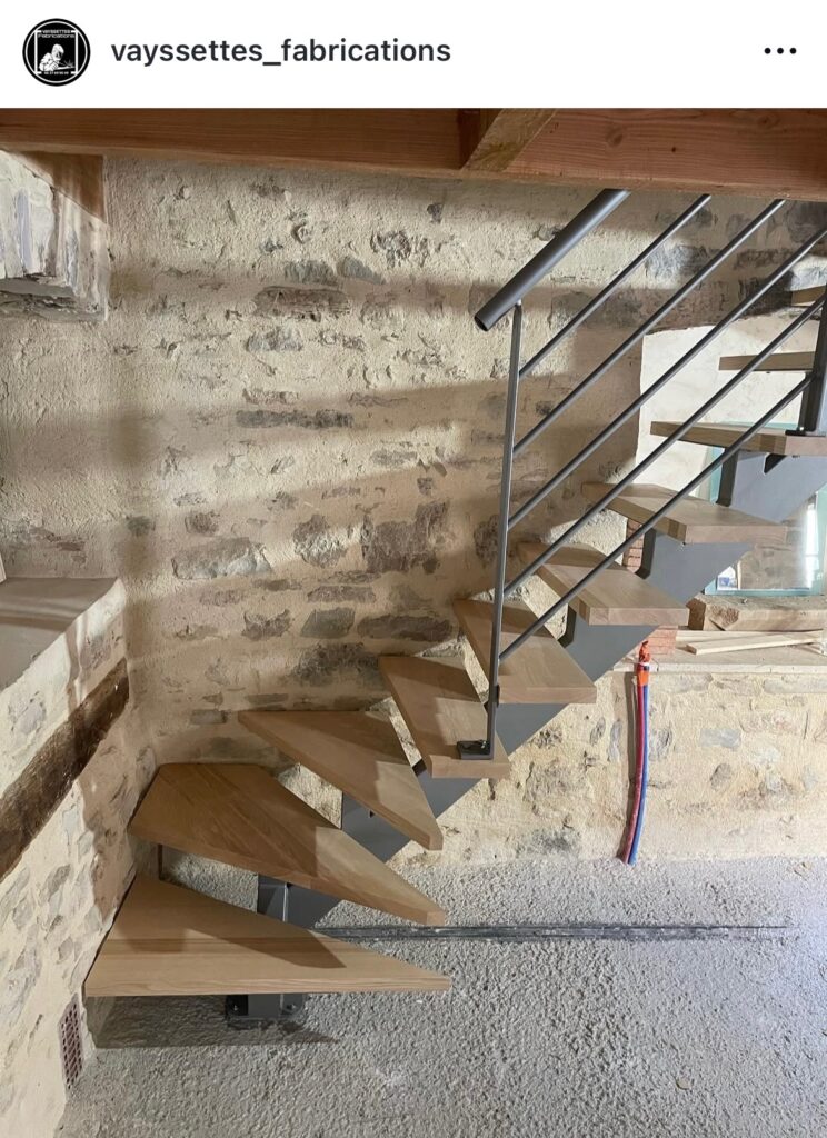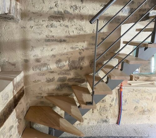 L’escalier est composé d’une armature en fer et de marche en bois. Fabrication de la structure fer : soudage, meulage, peinture. Fabrication marche en bois : délignage, dégauchissage, rabotage, ponçage et traitement du bois.