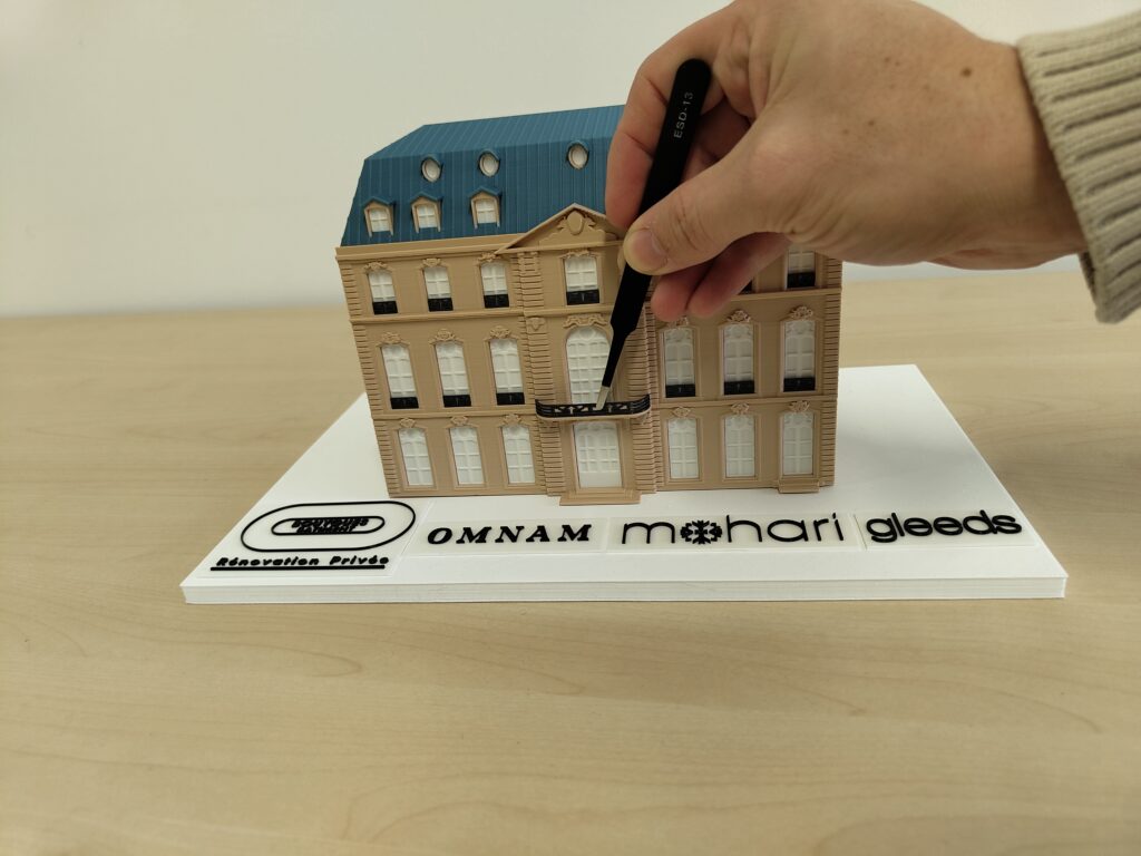Les maquettes sont fabriquées par impression 3D avec du plastique bio-sourcé. Elles sont réalisées à partir d’un plan et personnalisables en fonction de la demande. Nous réalisons toutes les étapes en interne : conception, fabrication par impression 3D et finition à la main.