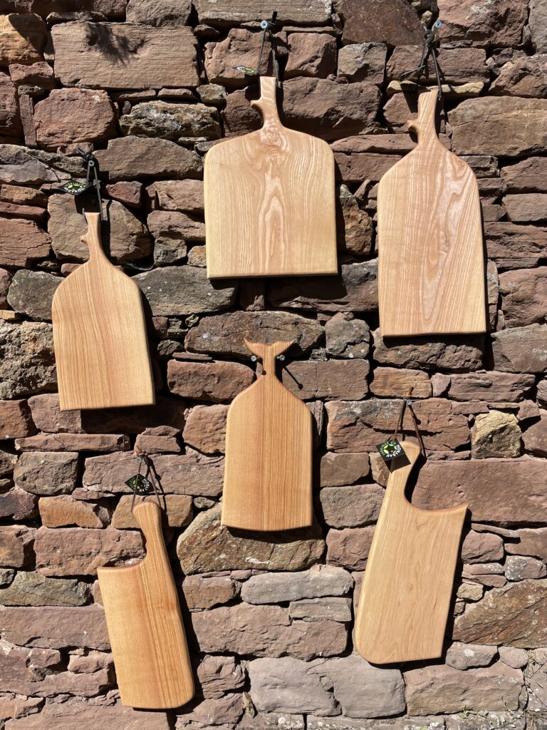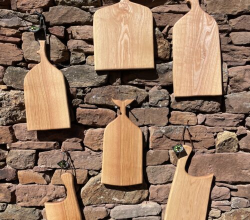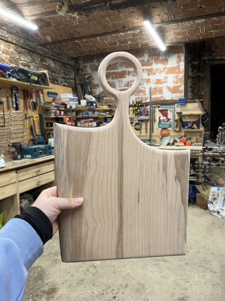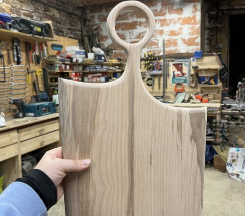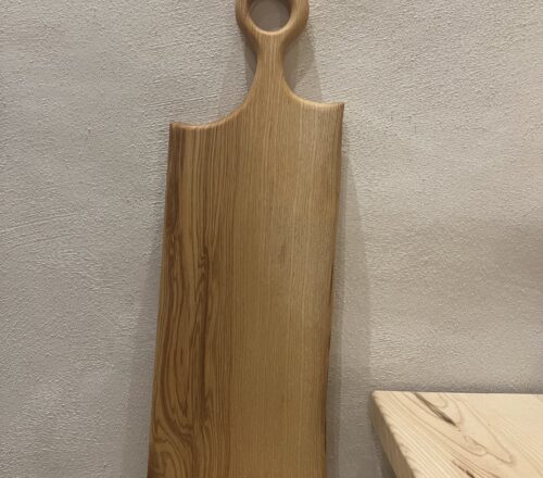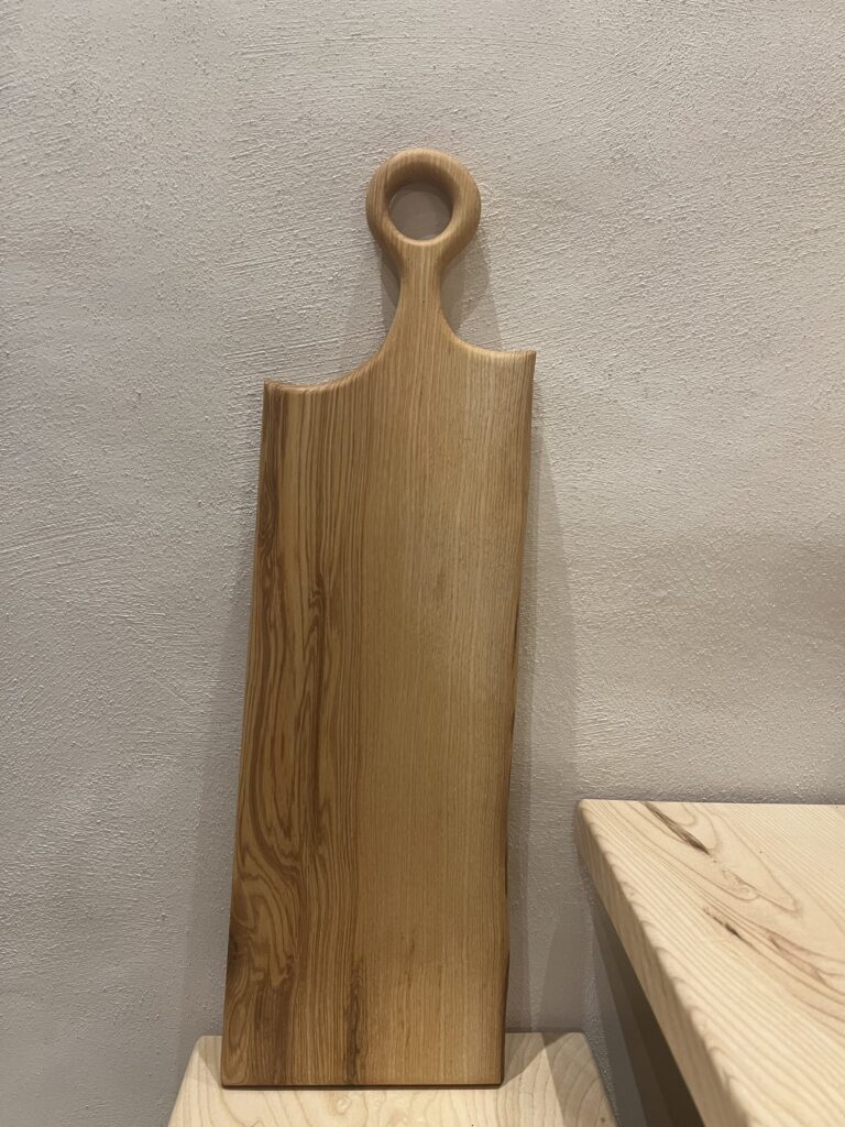 Réalisé à partir de bois brut en planche. Dans un premier temps, le bois est scié à la forme souhaitée. En second temps, la planche est dégauchie et rabotée à l’épaisseur finale. Ensuite les bords de la planche sont arrondis à l’aide d’une défonceuse. Pour finir, la planche est poncée, huilée et finalisée par une lanière de cuir qui lui permettra d’être suspendue.