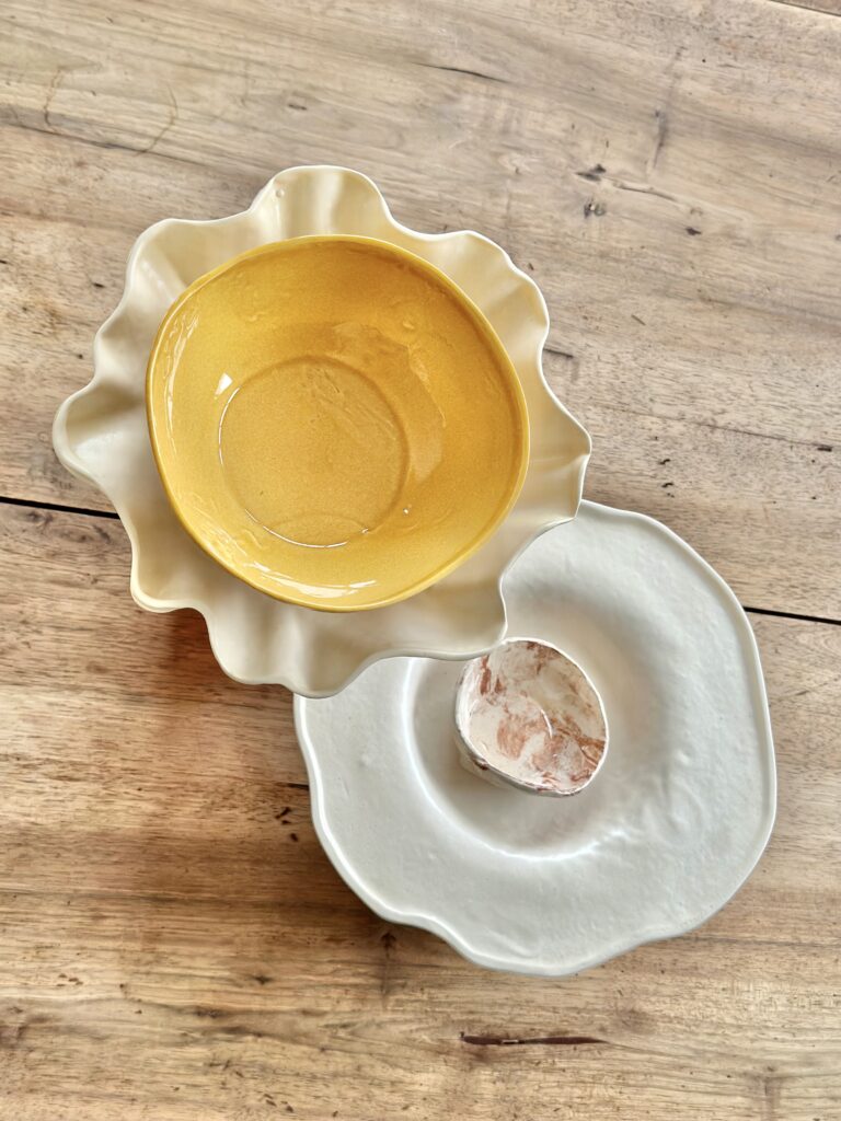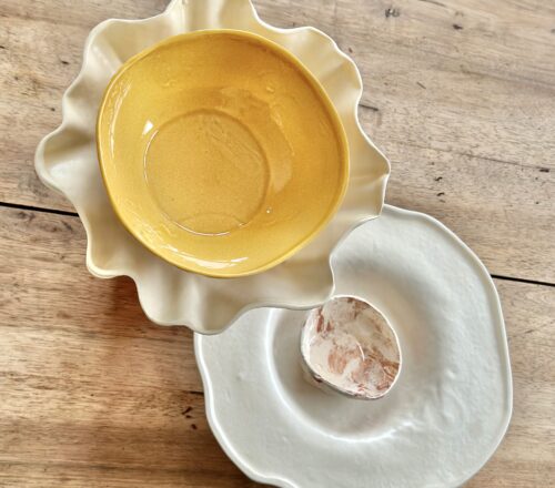 Les pièces céramiques, sorties de moule, sèchent naturellement, sont ensuite émaillées à la main avec des préparations spéciales alimentaires. Les émaux sont composés de divers minéraux.