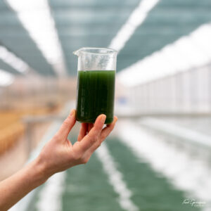 100% spiruline (Limnospira sp.) cultivée à la ferme, séchée à basse température, concassée et réduite en poudre.